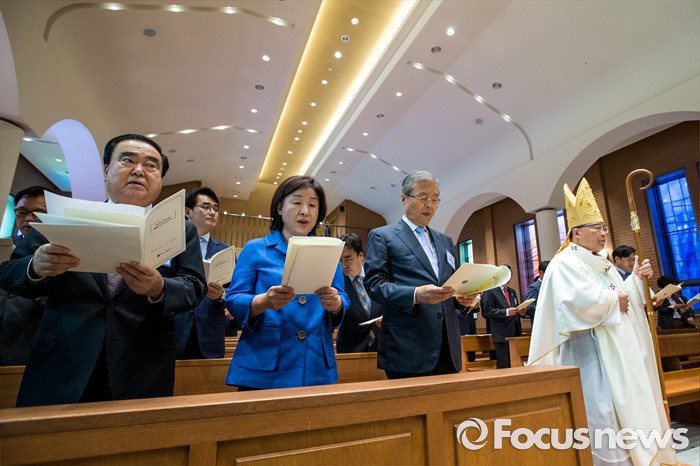 (서울=포커스뉴스) 염수정(오른쪽) 추기경이 30일 오전 서울 중구 명동성당에서 열린 '국회의원 카톨릭 교우회 감사 미사'를 진행하기 위해 입장 하고 있다. 왼쪽부터 문희상 더불어민주당 의원, 김종인 더불어민주당 비상대책위 대표, 심상정 정의당 상임대표.