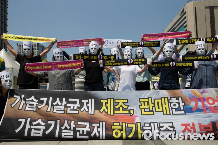 (서울=포커스뉴스) 30일 오후 서울 종로구 광화문 광장에서 환경보건시민센터 관계자들이 옥시 전 사장 검찰소환 조사 촉구하는 기자회견 및 퍼포먼스를 열고 있다.