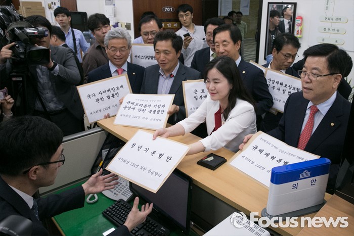(서울=포커스뉴스) 20대 국회 임기가 시작된 30일 오후 서울 여의도 국회 의안과에서 김광림(오른쪽 첫번째) 새누리당 정책위의장, 신보라(오른쪽 두번째) 청년소통특위 부위원장 등 의원들이 당론 1호법안인 청년기본법과 규제프리존법, 서비스법 등 9개 법안 서류를 제출하고 있다.