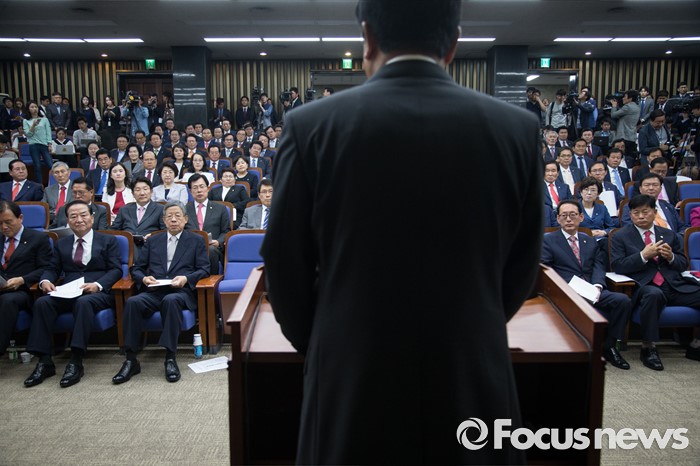 (서울=포커스뉴스) 김희옥(앞줄 왼쪽 세번째) 새누리당 비상대책혁신위원장 내정자와 서청원(앞줄 왼쪽 두번째) 의원이 30일 오전 서울 여의도 국회에서 열린 의원총회에 참석해, 정진석(뒷모습) 원내대표의 발언을 경청하고 있다.