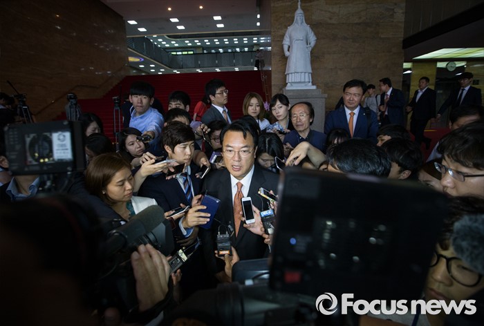 (서울=포커스뉴스) 정진석 새누리당 원내대표가 30일 오후 서울 여의도 국회에서 열린 의원총회를 마치고 국회를 나서던 중 취재진의 질문을 받고 있다.