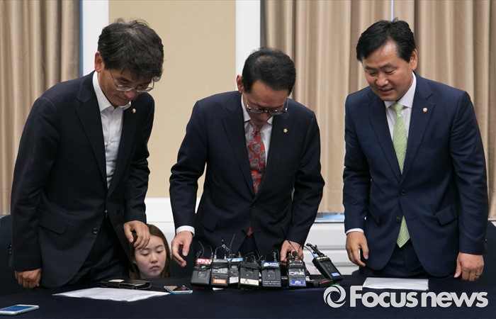 (서울=포커스뉴스) 30일 오후 서울 여의도 국회 귀빈식당에서 열린 20대 국회 원구상 협상 등을 위한 회동에 참석한 김도읍(가운데) 새누리당 원내수석부대표, 박완주(왼쪽) 더불어민주당 원내수석부대표, 김관영 국민의당 원내수석부대표가 취재진을 향해 포즈를 취한 뒤 자리에 앉고 있다.