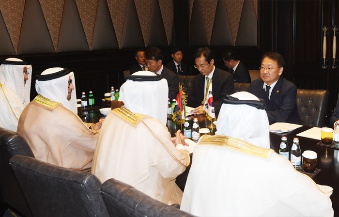 (서울=포커스뉴스) 유일호 부총리 겸 기획재정부 장관이 30일(현지시간) UAE 아부다비 St.REGIS호텔에서 열린 '제5차 한-UAE 경제공동위'에 참석, 회의시작에 앞서 수석대표인 알 만수리 경제부 장관과 사전면담을 하고 있다. <사진제공=기획재정부>