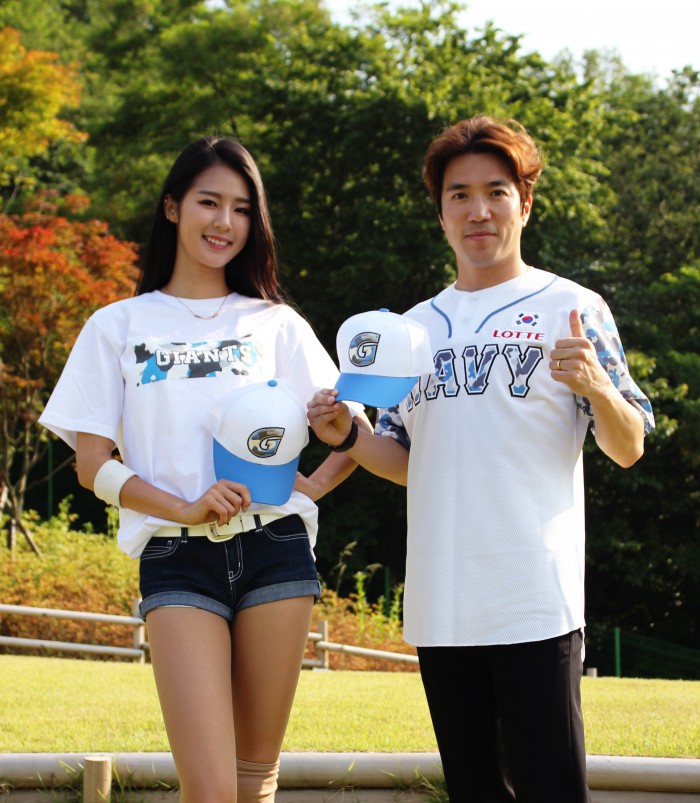 롯데 선수단은 6월 호국보훈의 달을 기념하며 6월5일 사직 NC전과 6월28일 사직 삼성전에 '해군 NAVY 유니폼'을 입고 경기에 나선다. 선수들이 직접 착용한 밀리터리 유니폼은 친필 사인 뒤 구단 페이스북을 통해 경매로 판매된다. 경매는 자이언츠숍에서 일정금액 이상 상품을 구매한 고객에 한해 참여할 수 있다. 경매 및 판매 수익금은 시즌 종료 뒤 기부된다.프로야구 롯데가 새 밀리터리 유니폼인 '해군 NAVY 유니폼'을 출시한다. 롯데 조지훈 응원단장(오른쪽)과 치어리더 박기량이 새로 출시된 유니폼과 티셔츠를 입고 모자를 들고 포즈를 취하고 있다. <사진제공=롯데 자이언츠>