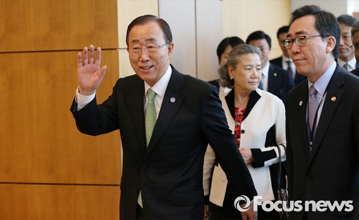 (인천공항=포커스뉴스) 방한일정을 마친 반기문 유엔 사무총장이 30일 오후 인천국제공항에서 출국에 앞서 취재진에 손을 들어 인사하고 있다.