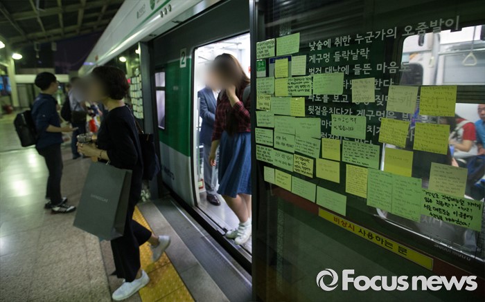 (서울=포커스뉴스) 30일 오후 서울 광진구 구의역 내 스크린도어 사망사고 발생 장소인 9-4 승강장에 추모 쪽지가 붙어 있다.