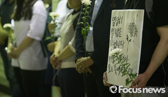 (서울=포커스뉴스) 30일 오후 서울 광진구 구의역 내 스크린도어 사망사고 발생 장소인 9-4 승강장에서 시민들이 국화를 들고 고인을 추모하고 있다.