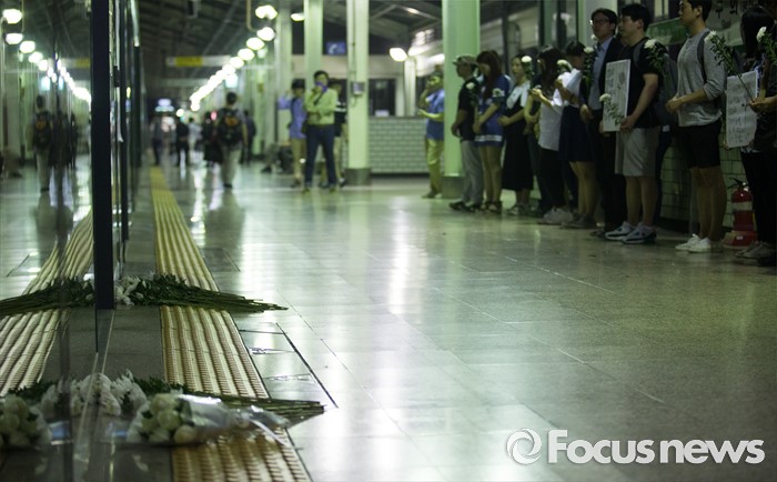 (서울=포커스뉴스) 30일 오후 서울 광진구 구의역 내 스크린도어 사망사고 발생 장소인 9-4 승강장에서 시민들이 국화를 들고 고인을 추모하고 있다.