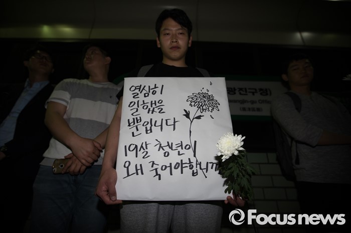 (서울=포커스뉴스) 30일 오후 서울 광진구 구의역 내 스크린도어 사망사고 발생 장소인 9-4 승강장에서 시민들이 고인을 추모하고 있다.
