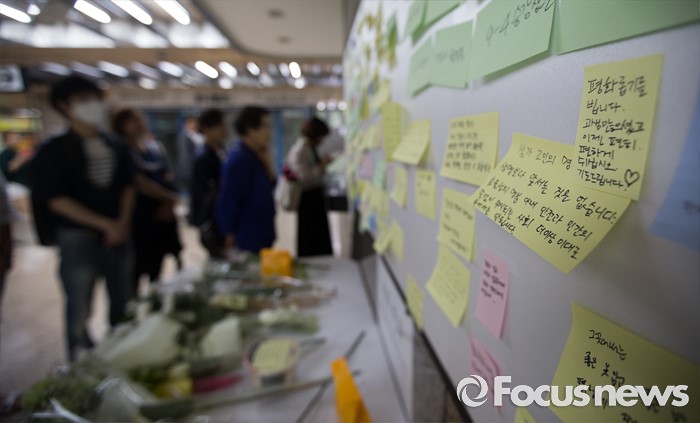 (서울=포커스뉴스) 30일 오후 서울 광진구 구의역 내에 마련된 스크린도어 사망사고 추모 장소에 고인을 추모하는 쪽지와 국화가 정리되어 있다.