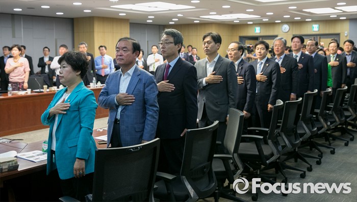 (서울=포커스뉴스) 31일 오전 서울 여의도 국회 의원회관에서 열린 국민의당 8차 정책역량강화 워크숍에 참석한 의원들이 국기에 대한 경례를 하고 있다.