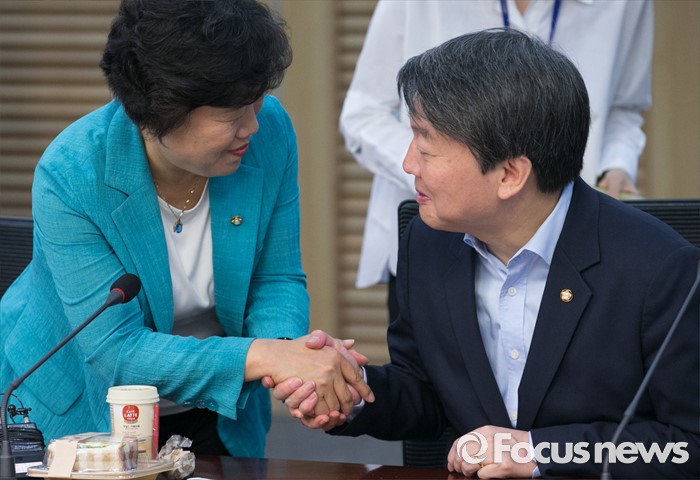 (서울=포커스뉴스) 31일 오전 서울 여의도 국회 의원회관에서 열린 국민의당 8차 정책역량강화 워크숍에 참석한 안철수(오른쪽) 상임공동대표와 조배숙 의원이 인사하고 있다.