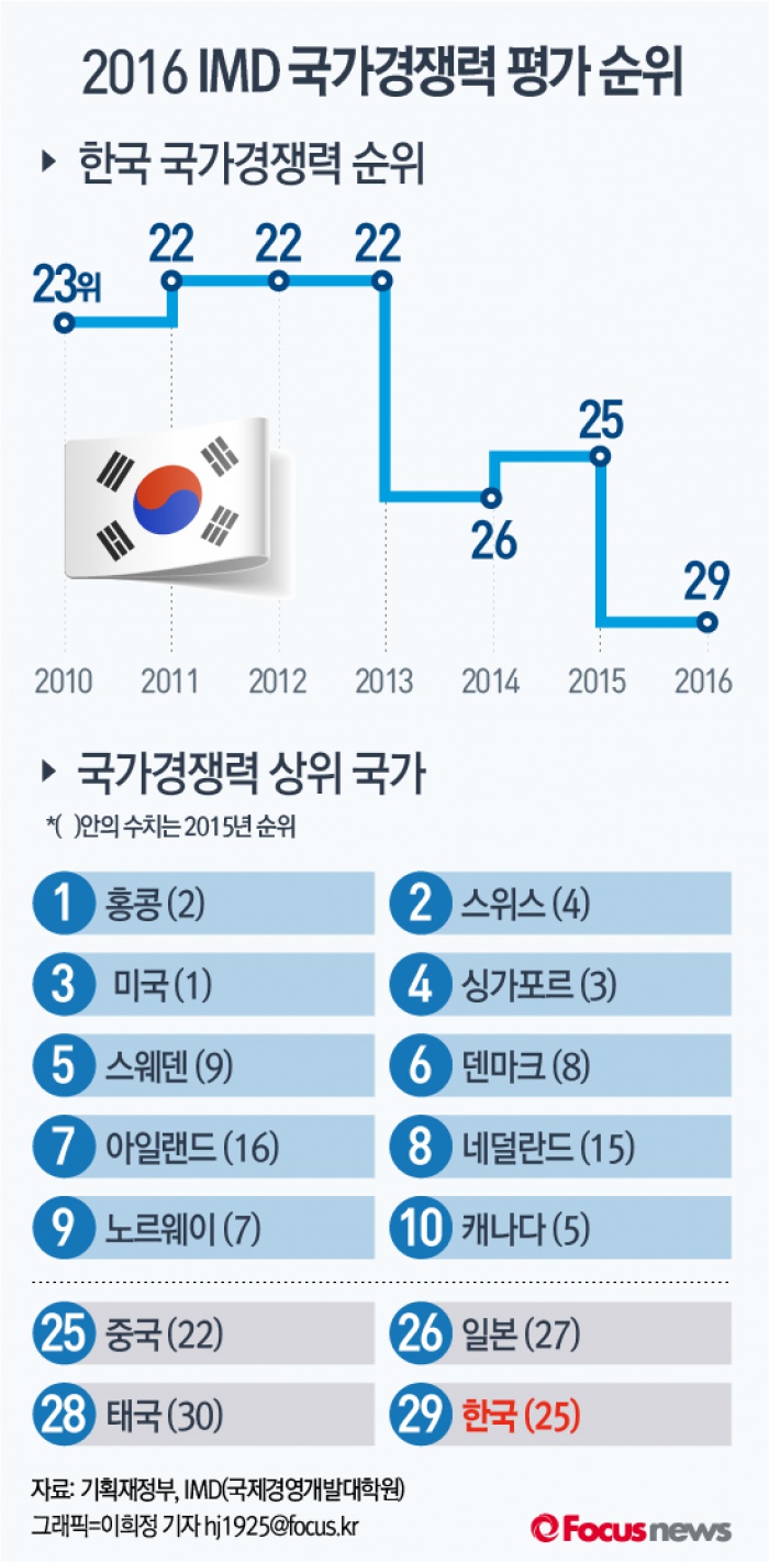 (서울=포커스뉴스) 30일 스위스 국제경영개발연구원(IMD)이 발표한 ‘2016년 국가경쟁력 평가’에 따르면 우리나라의 종합순위는 평가대상 61개국 중 29위로 떨어졌다.