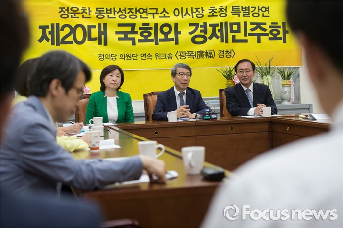(서울=포커스뉴스) 31일 오전 국회에서 열린 정운찬 동반성장연구소 이사장 초청 특별강연에서 정 이사장이 강연하고 있다. 이날 강연은 정의당의 '성역없이 듣겠습니다'란 이름의 의원단 연속 워크숍 '광폭 경청'의 일환으로 열렸다. 뒷줄 오른쪽 첫번째부터 노회찬 정의당 원내대표, 정 이사장, 심상정 대표