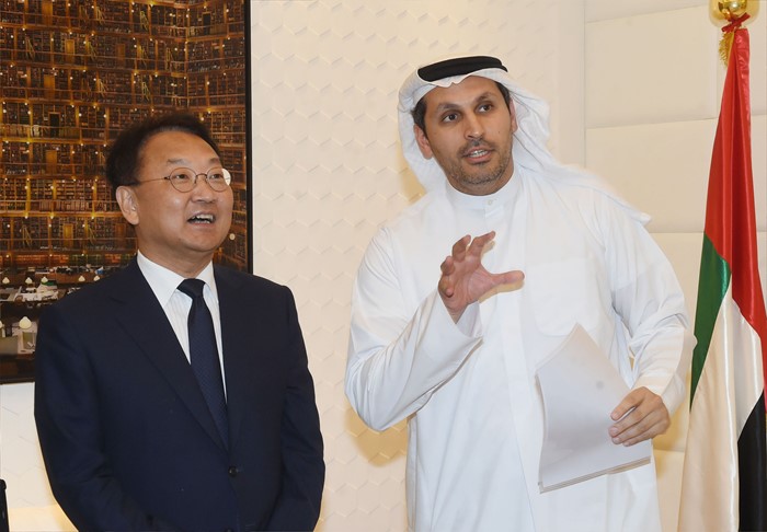 (서울=포커스뉴스) 제5차 한-UAE 경제공동위 참석차 UAE 아부다비를 방문중인 유일호 부총리 겸 기획재정부 장관이 30일(현지시간) 알 무바라크 아부다비 행정청 장관과 면담에 앞서 담소를 나누고 있다. <사진제공=기획재정부>