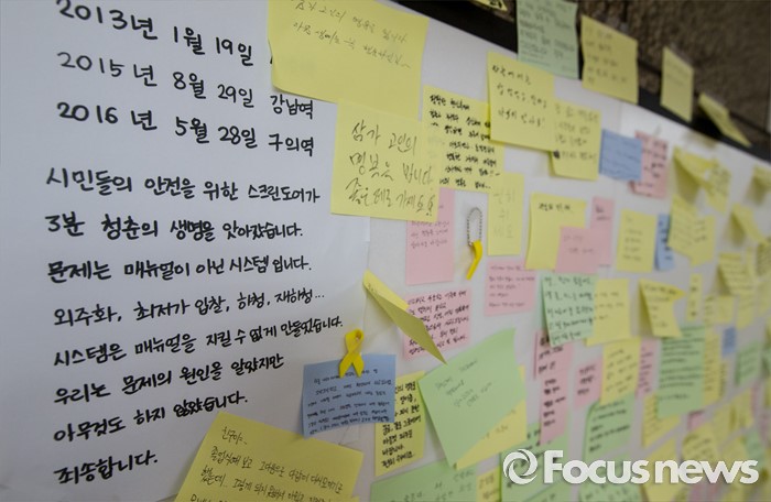 (서울=포커스뉴스) 31일 오전 서울 광진구 지하철 2호선 구의역에 스크린도어 사고로 희생된 청년을 애도하는 헌시 및 쪽지들이 붙어 있다.