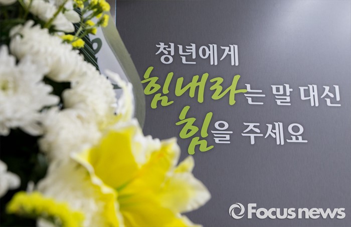 (서울=포커스뉴스) 31일 오전 서울 광진구 지하철 2호선 구의역에 마련된 스크린도어 사고 희생 청년 추모공간에 놓인 근조화환 너머로 서울시 광고메세지가 붙어 있다.