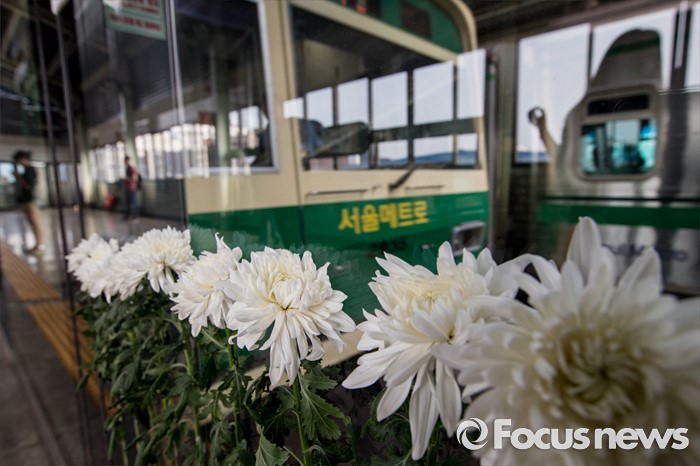 (서울=포커스뉴스) 31일 오전 서울 광진구 지하철 2호선 구의역 스크린도어 사고 현장에 시민들의 추모 국화가 붙어 있다.