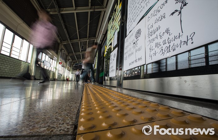 (서울=포커스뉴스) 31일 오전 서울 광진구 지하철 2호선 구의역 스크린도어 사고 현장에 시민들의 추모 쪽지 및 국화가 붙어 있다.
