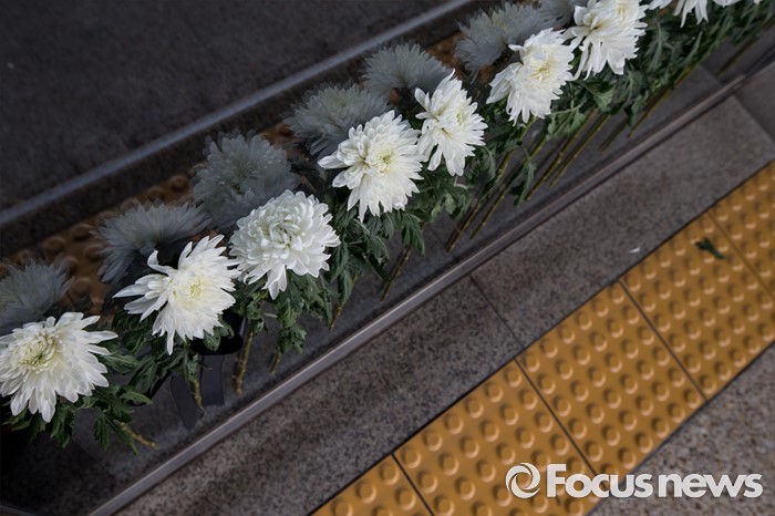 (서울=포커스뉴스) 31일 오전 서울 광진구 지하철 2호선 구의역 스크린도어 사고 현장에 시민들의 추모 국화가 붙어 있다.