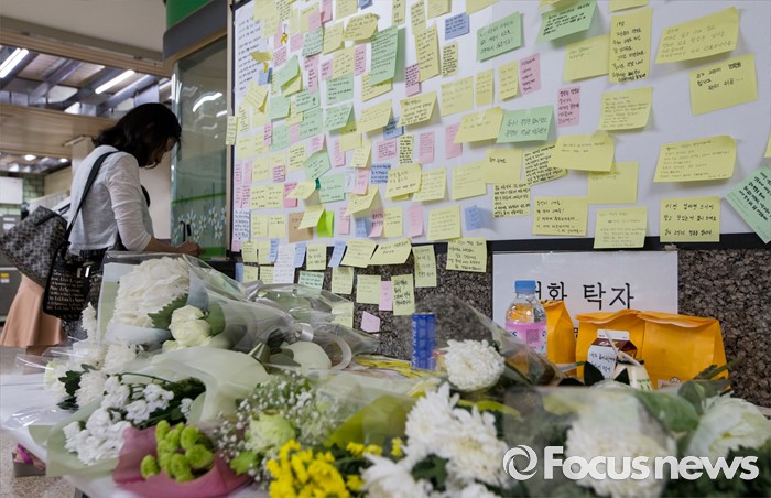 (서울=포커스뉴스) 31일 오전 서울 광진구 지하철 2호선 구의역에 마련된 스크린도어 사고 희생 청년 추모공간에서 시민들이 추모의 쪽지를 적고 있다.