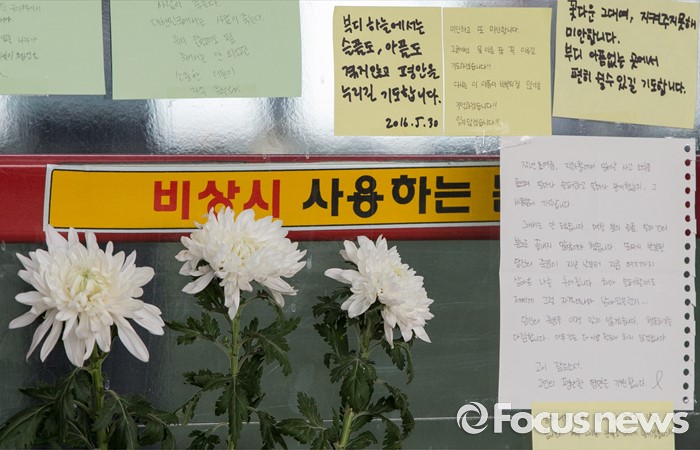 (서울=포커스뉴스) 31일 오전 서울 광진구 지하철 2호선 구의역 스크린도어 사고 현장에 시민들의 추모 쪽지 및 국화가 붙어 있다.
