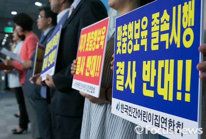 (서울=포커스뉴스) 31일 오전 서울 여의도 국회 정론관에서 한정애 더불어민주당 의원과 장진환 한국민간어린이집연합회장 등 관계자들이 어린이집 생존권 위협하는 맞춤형 보육 철회 촉구 기자회견을 하고 있다.