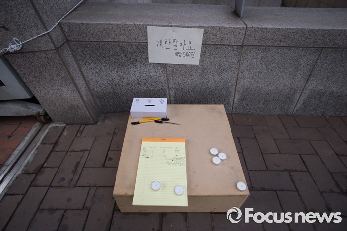 (서울=포커스뉴스) 31일 오전 서울 마포구 홍익대 정문 앞에 설치 된 '일베' 상징물 조각상 아래 '계란 팔아요'란 메모와 함께 작은 모금함이 놓여져 있다.