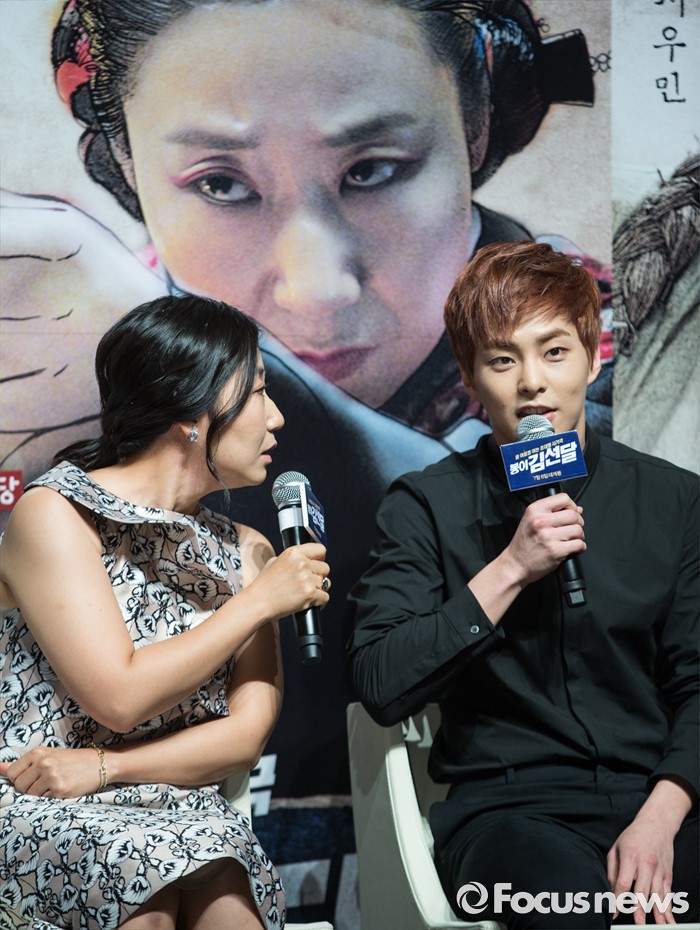 (서울=포커스뉴스) 31일 오전 서울 강남구 압구정CGV에서 열린 영화 '봉이 김선달' 제작보고회에 참석한 배우 시우민(오른쪽)이 질문에 답하고 있다. 왼쪽부터 배우 라미란, 시우민.