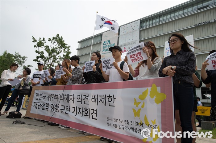 (서울=포커스뉴스) 한일 일본군위안부 합의 무효를 위한 대학생 대책위원회 학생들이 31일 오전 서울 종로구 대한민국역사박물관 앞에서 일본군위안부 피해자 의견 배제한 재단설립 강행 규탄 기자회견을 열고 있다.