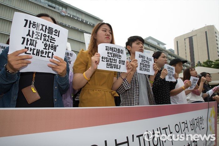 (서울=포커스뉴스) 한일 일본군위안부 합의 무효를 위한 대학생 대책위원회 학생들이 31일 오전 서울 종로구 대한민국역사박물관 앞에서 일본군위안부 피해자 의견 배제한 재단설립 강행 규탄 기자회견을 열고 있다.