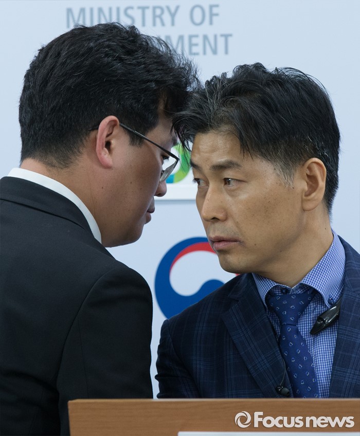 (세종=포커스뉴스) 서흥원(오른쪽) 환경부 환경보건정책과장이 31일 오전 세종시 정부세종청사 환경부 기자실에서 가습기살균제 피해 지원 지자체와 함께 한다는 브리핑중에 논의하고 있다.
