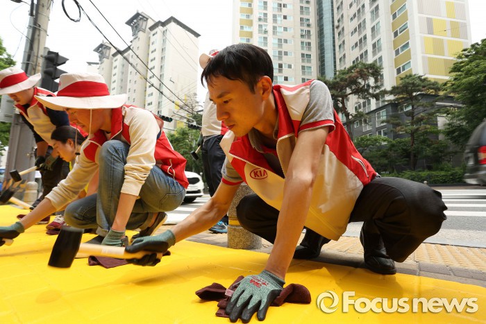 이외에도 기아차는 임직원들이 직접 기획한 주거환경개선, 재능기부 등의 다양한 봉사활동을 함께 실천했다.기아차 창립기념 특별 봉사활동 주간인 'K 챌린저 위크(K-Challenger Week)'에 참가한 기아차 임직원들이 보행자 사고 예방을 위해 초등학교 인근 횡단보도 앞에 노란색의 미끄럼 방지 재질의 '옐로 카펫'을 설치하고 있는 모습. <사진제공=기아자동차>
