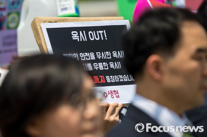 (서울=포커스뉴스) 31일 오후 서울 여의도 국회 앞에서 경제정의실천시민연합 관계자들이 옥시 제품 불매 및 옥시 예방법 제정을 촉구하는 기자회견을 하고 있다.