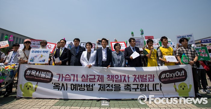 (서울=포커스뉴스) 31일 오후 서울 여의도 국회 앞에서 경제정의실천시민연합 관계자들이 옥시 제품 불매 및 옥시 예방법 제정을 촉구하는 기자회견을 하고 있다.