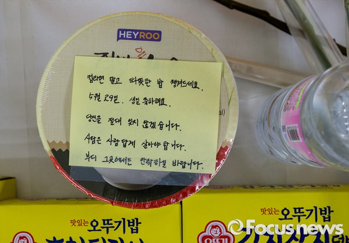 이어 "운행 중인 시간에는 선로 작업을 금지해 일하는 노동자의 생존을 보장하라"며 "이것이 제일 시급하다"고 강조했다.31일 오전 서울 광진구 지하철 2호선 구의역에 마련된 스크린도어 사고 희생 청년 추모공간에 희생자를 위한 즉석밥과 추모의 글이 놓여 있다. 2016.05.31 양지웅 기자