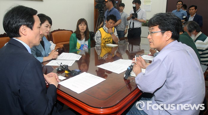 (서울=포커스뉴스) 우상호 더불어민주당 원내대표가 31일 오전 서울 여의도 국회에서 가습기 살균제 피해자 가족과 면담을 하고 있다.