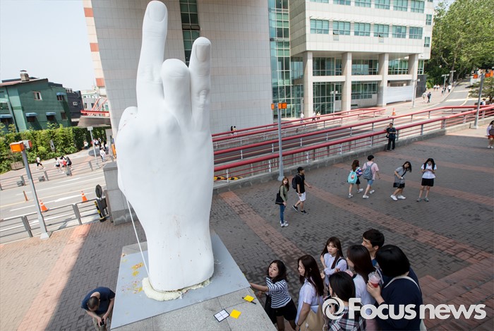 (서울=포커스뉴스) 31일 오후 서울 마포구 홍익대학교 정문에 극우성향 사이트 '일베' 상징물 조각상이 설치돼 있다. 조각상은 일간베스트저장소를 상징하는 자음 'ㅇ'과 'ㅂ' 모양을 하며 회원을 인증하는 손 모양이다. '어디에나 있고, 아무데도 없다'는 제목의 이 조각상은 조소과 4학년 홍기하씨가 '환경조각연구' 수업 과제로 제작해 야외조각전에 출품한 것이다.