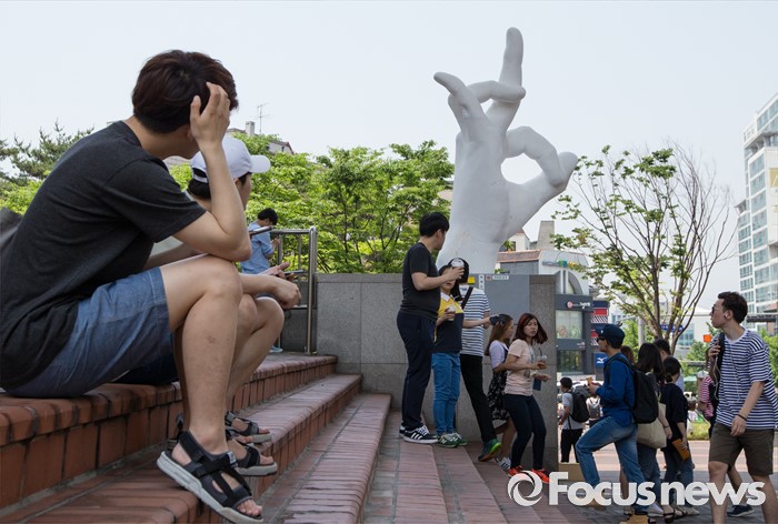 (서울=포커스뉴스) 31일 오후 서울 마포구 홍익대학교 정문에 극우성향 사이트 '일베' 상징물 조각상이 설치돼 있다. 조각상은 일간베스트저장소를 상징하는 자음 'ㅇ'과 'ㅂ' 모양을 하며 회원을 인증하는 손 모양이다. '어디에나 있고, 아무데도 없다'는 제목의 이 조각상은 조소과 4학년 홍기하씨가 '환경조각연구' 수업 과제로 제작해 야외조각전에 출품한 것이다.