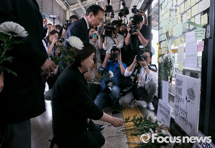 (서울=포커스뉴스) 심상정 정의당 상임대표와 노회찬 원내대표 등 의원들이 31일 오후 서울 광진구 지하철 구의역에서 스크린도어 정비 작업 중 사고로 숨진 김모(19) 씨의 사건장소를 방문해 고인을 추모하고 있다.