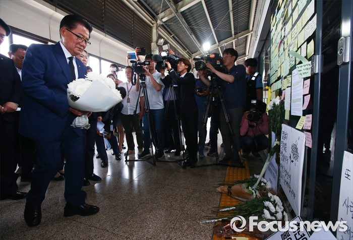 (서울=포커스뉴스) 박지원 국민의당 원내대표 등 의원들이 31일 오후 서울 광진구 지하철 구의역에서 스크린도어 정비 작업 중 사고로 숨진 김모(19) 씨의 사건장소를 방문해 고인을 추모하고 있다.
