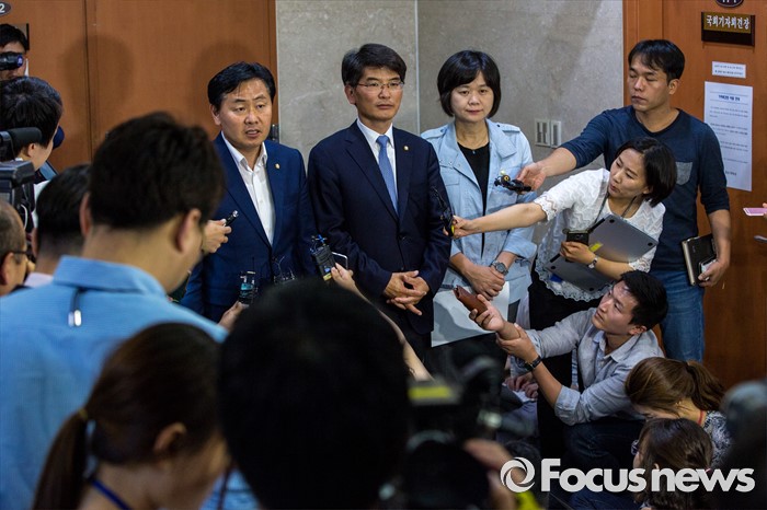 (서울=포커스뉴스) 야3당 원내수석부대표들이 31일 오후 서울 여의도 국회에서 가습기 살균제 사건, 세월호특별법 제정, 어버이연합 게이트 등 현안 공조 관련 브리핑을 마친 뒤 기자회견장을 나서고 있다. 왼쪽부터 김관영 국민의당 원내수석부대표, 박완주 더불어민주당 원내수석 부대표, 이정미 정의당 원내수석부대표.
