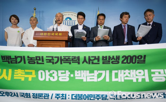 (서울=포커스뉴스) 31일 오후 서울 여의도 국회 정론관에서 야 3당 의원들과 백남기 대책위 회원들이 '백남기 농민 사건 발생 200일째'를 맞아 국회 청문회 실시를 촉구하는 기자회견을 하고 있다.
