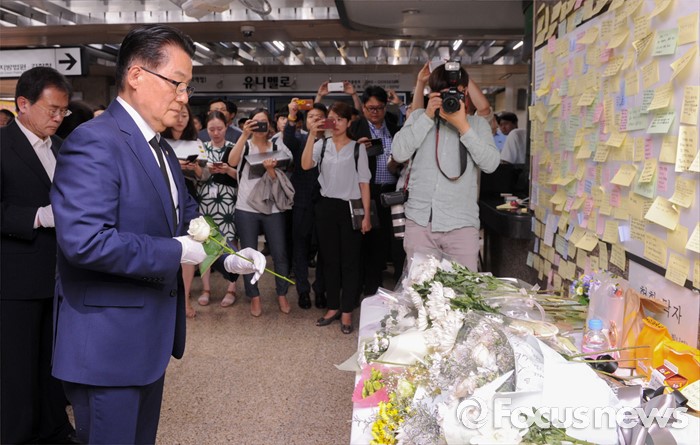(서울=포커스뉴스) 박지원 국민의당 원내대표 등 의원들이 31일 오후 서울 광진구 지하철 구의역에서 스크린도어 정비 작업 중 사고로 숨진 김모(19) 씨의 추모공간을 방문해 헌화하고 있다.