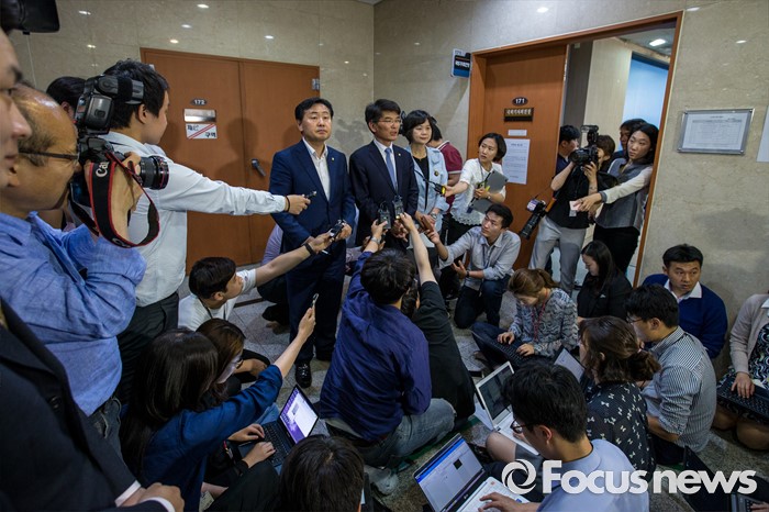 (서울=포커스뉴스) 야3당 원내수석부대표들이 31일 오후 서울 여의도 국회에서 가습기 살균제 사건, 세월호특별법 제정, 어버이연합 게이트 등 현안 공조 관련 브리핑을 마친 뒤 기자회견장을 나서고 있다. 왼쪽부터 김관영 국민의당 원내수석부대표, 박완주 더불어민주당 원내수석 부대표, 이정미 정의당 원내수석부대표.