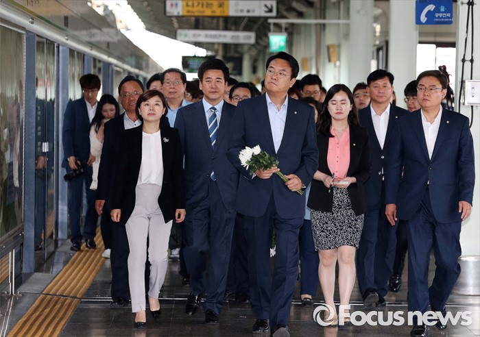(서울=포커스뉴스) 정진석 새누리당 원내대표 등 의원들이 31일 오후 서울 광진구 지하철 구의역에서 스크린도어 정비 작업 중 사고로 숨진 김모(19) 씨의 사건장소를 방문해 고인을 추모하기 위해 이동하고 있다.