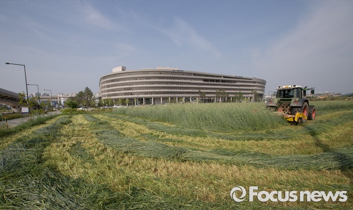 (세종=포커스뉴스) 31일 오후 세종시 정부세종청사 인근 한국토지주택공사 부지에 심은 호밀을 수확하고 있다.