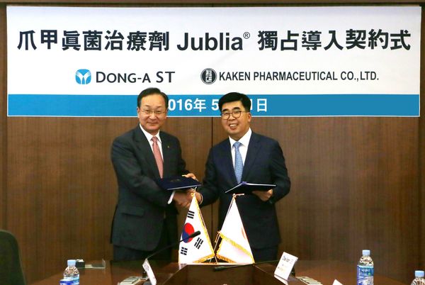 (서울=포커스뉴스) 동아에스티(대표이사 사장 강수형)는 31일 오전 용신동 본사에서, 일본 카켄제약주식회사(Kaken Pharmaceutical Co., Ltd)와 바르는 손발톱무좀치료제 신약 ‘주블리아(Jublia)’의 국내 판권 계약 체결식을 가졌다고 31일 밝혔다.