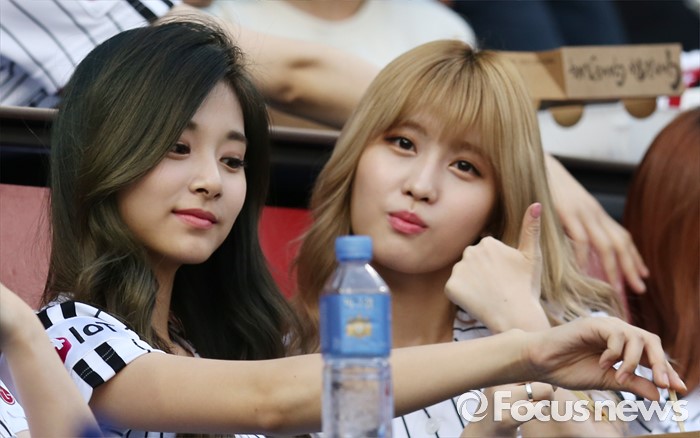 (서울=포커스뉴스) 31일 서울 잠실구장에서 열린 2016 프로야구 KIA-LG 경기에서 인기 걸그룹 트와이스의 쯔위(왼쪽)와 모모가 중앙 관중석에서 경기를 즐기고 있다.
