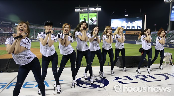 (서울=포커스뉴스) 31일 서울 잠실구장에서 열린 2016 프로야구 KIA-LG 경기에 인기 걸그룹 트와이스가 시구, 시타로 참여한뒤 경기 중간 응원단상에 올라 관중에게 노래와 춤을 선사하고 있다.